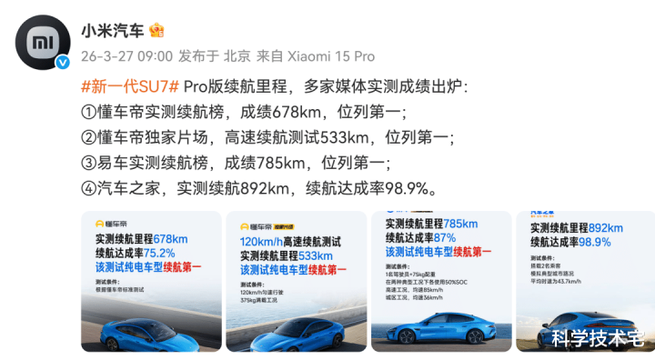 那么,新一代小米SU7的续航收货如何呢?小米汽车今天认真文告,新一代小米SU7 Pro在各大机构的测试中,基本上齐是第别称。