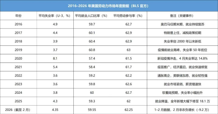 这是2016–2026年好意思国劳能源市集年度数据(来自好意思国劳工统计局)。