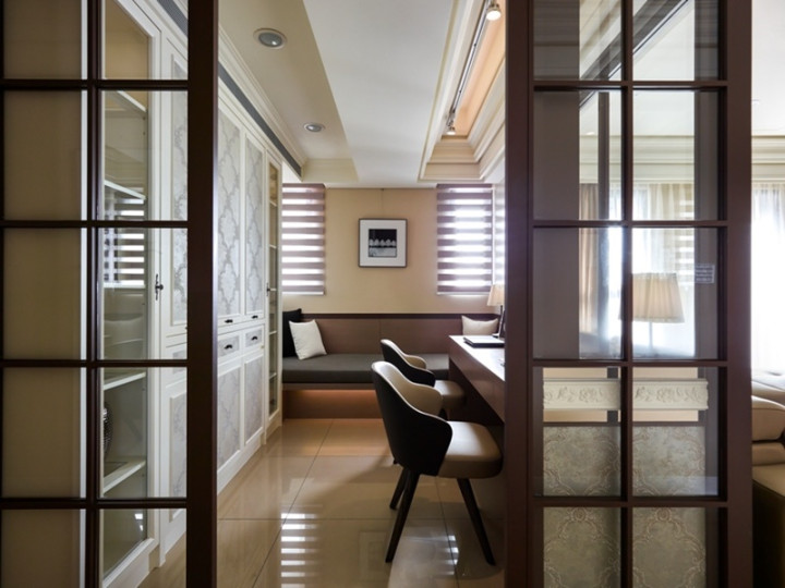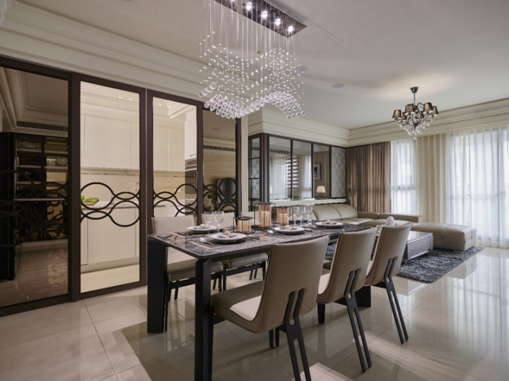 磨练统合:门片与屏风仪镀钛雕花精细勾画,造型语汇纠合全室,展现内敛与良好的空间风貌。