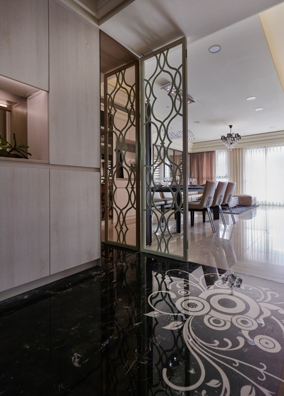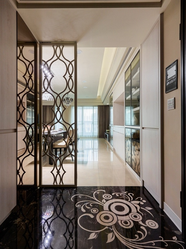 家徽端景:玄关地坪及屏风融入专属图腾,标记动线的起首,也刻划对家的包摄感。