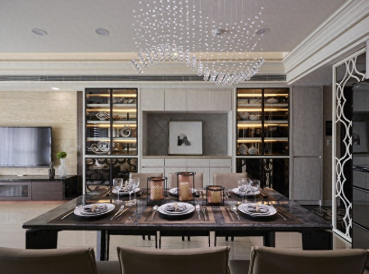 光影重奏:餐区灯具以层迭串珠刻画弧形律动,在当代造型中演译古典好意思学。