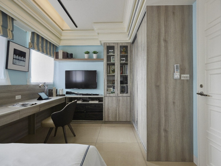 亮堂次卧:次卧采取淡色与节约线条构筑,对应孩童生存的崭新节拍。