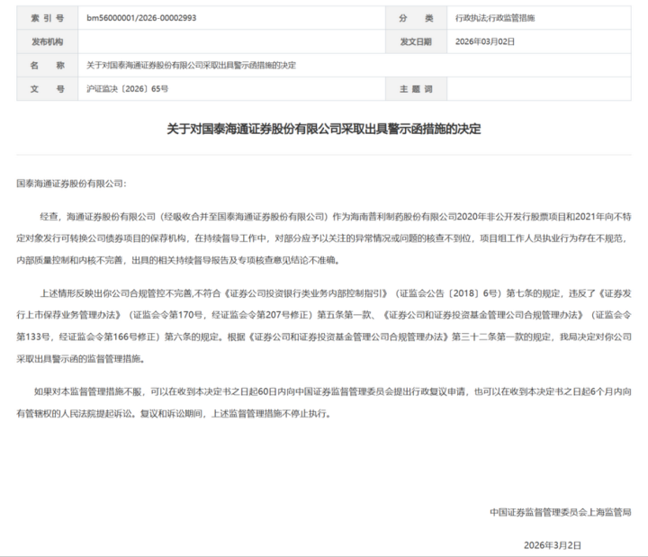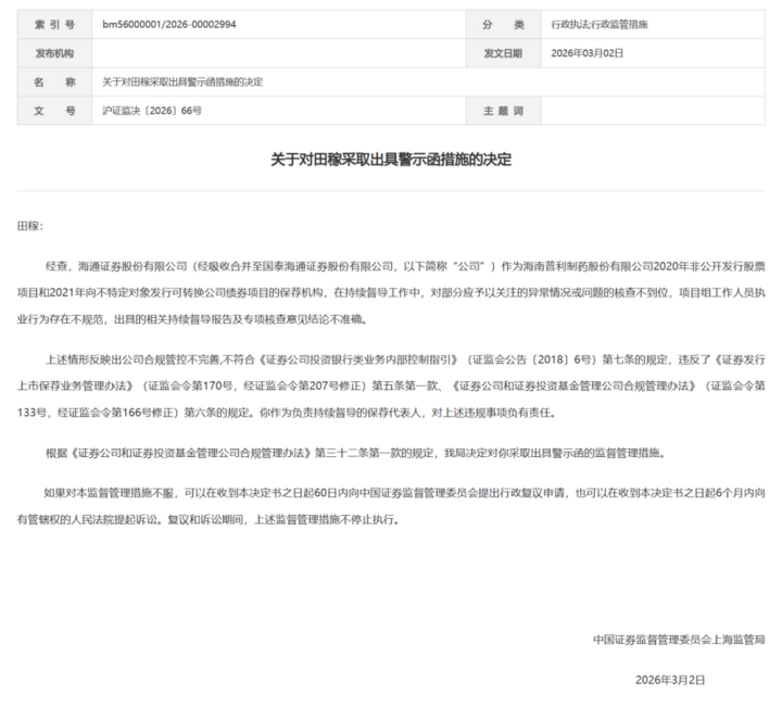 海通证券的非法案例发生在未摄取吞并至国泰海通证券之前,因合规管控体系不完善,在保荐技俩握续督导设施存在多项非法情形,最终被出具警示函。