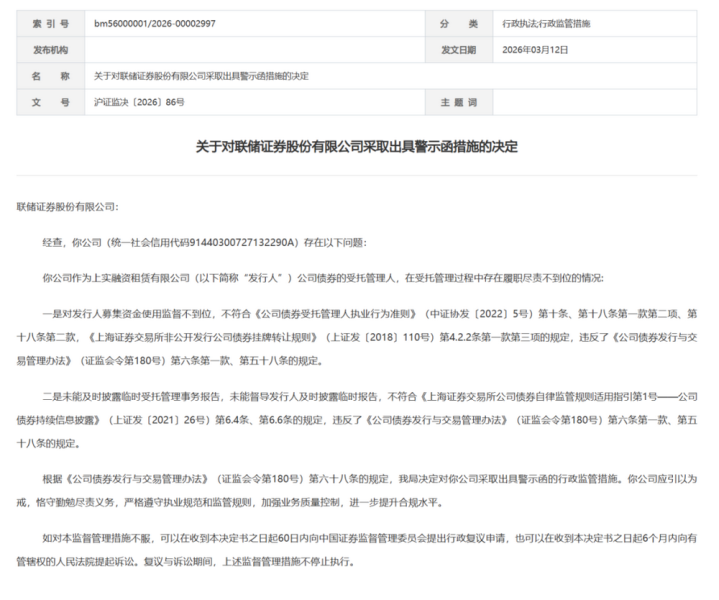 联储证券也因债券技俩非法收到监管罚单,这次非法直指其手脚受托管束东谈主的履职缺位,而对应的刊行东谈主上实租出也因多项刊行及信息败露非法被同步追责。
