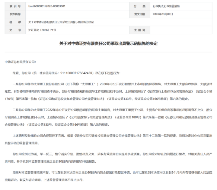 中德证券因在太原重工两起有关技俩保荐及承销流程中履职不妥,存在以下2大非法事项: