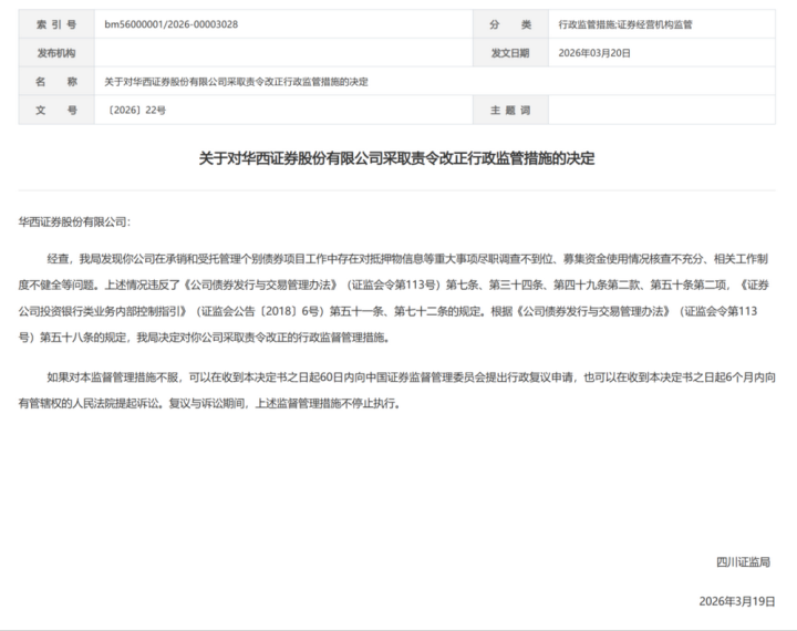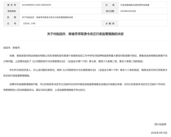 3月20日,四川证监局于华西证券与有关技俩认真东谈主出具了2张罚单。经查,华西证券在承销和受托管束个别债券技俩职责中存在对典质物信息等紧要事项守法拜谒不到位、召募资金使用情况核查不充分、有关职责轨制不健全等问题。2名技俩认真东谈主赵喆杰陈瑜芳因前述问题与公司均被领受责令改正的监管措施。