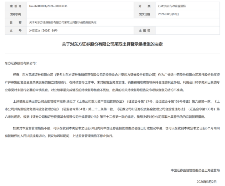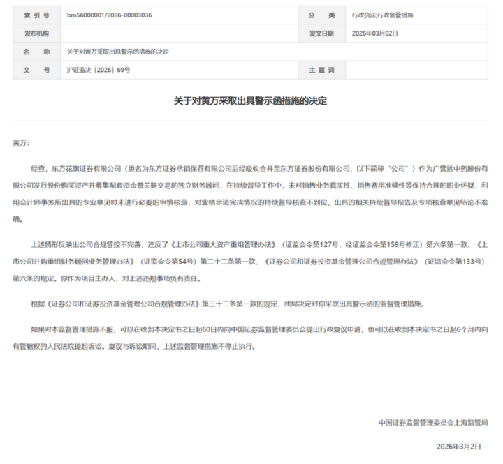 东方证券:重组技俩握续督导非法,技俩主持东谈主也被罚