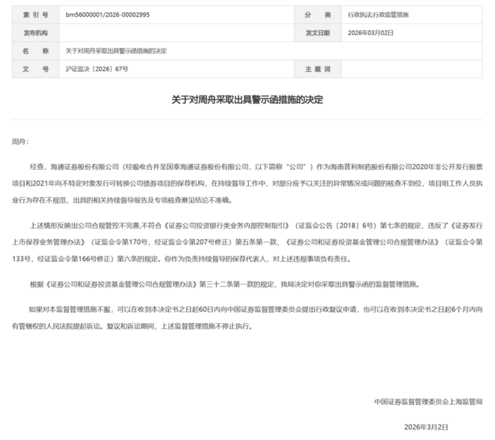 罚单骄傲,海通证券曾担任过普利制药2020年非公建造行股票技俩,以及2021年向不特定对象刊行可诊治公司债券项指标保荐机构。但在在握续督导职责中,存在以下4方面问题:
