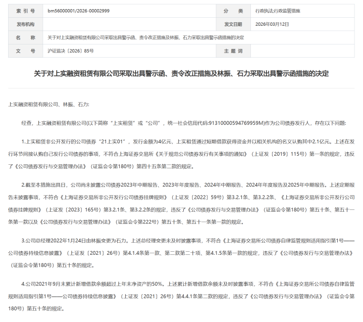 针对上述行动,监管对上实租出领受出局警示函、责令改正的措施,公司董事长林振与时任总司理石力则均被监管出具警示函。