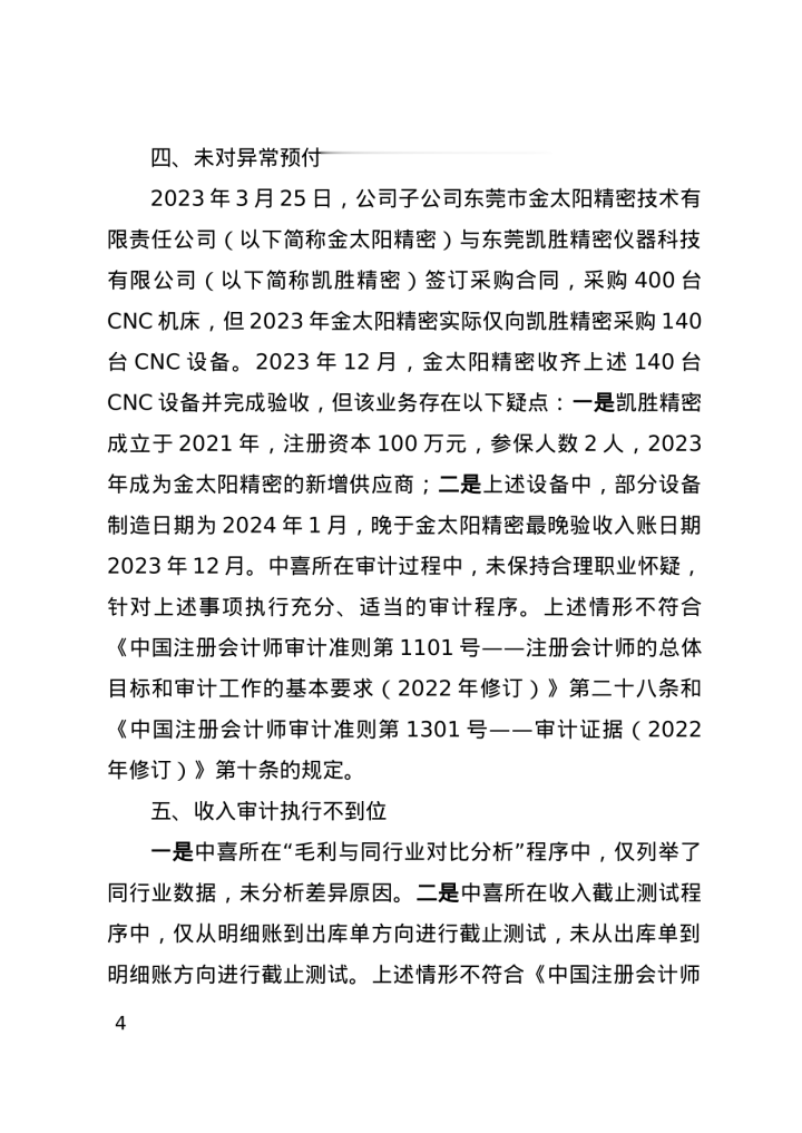 决定书泄露,中喜司帐师事务所(稀奇平庸合资)在对东莞金太阳研磨股份有限公司2023年年报审计职责中存在多项问题。包括风险评估门径本质不充分、欺压测试门径本质不到位、函证门径本质不到位、未对极度预支款项保执合理做事怀疑、收入审计本质不到位以过甚他问题,B体育如未本质司帐分录测试和孤独性声明签署日历晚于轨则期间。