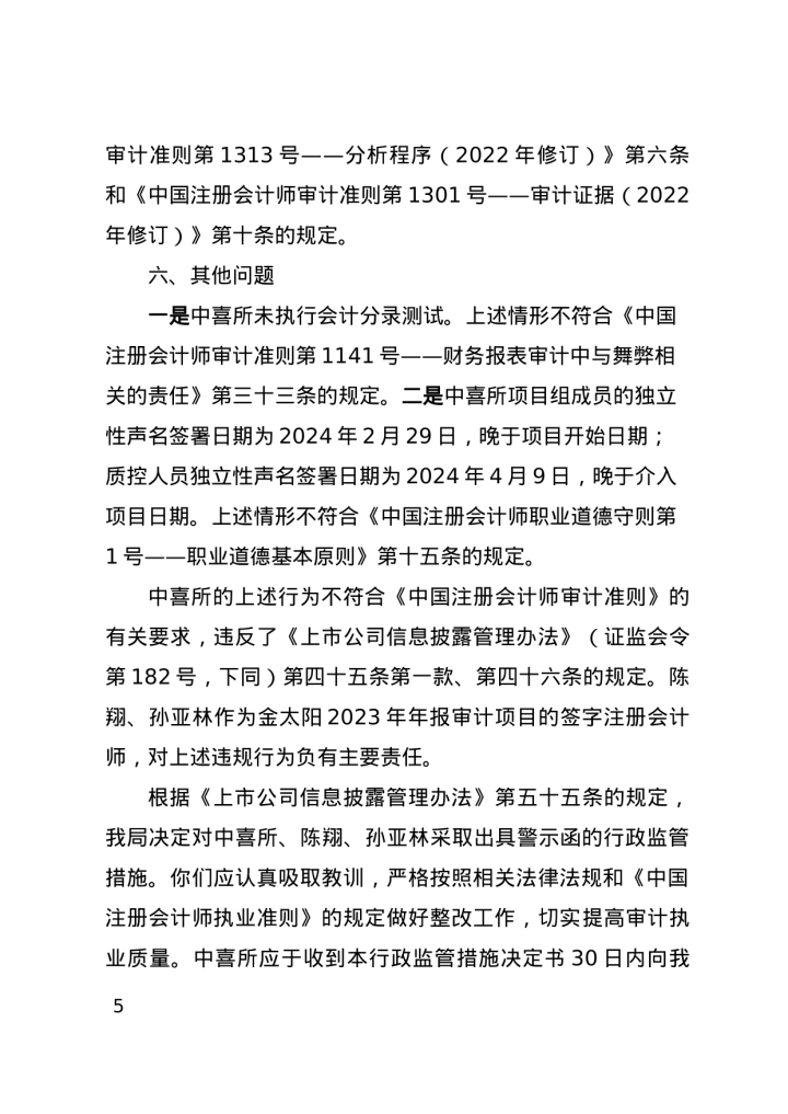上述行动不适应《中国注册司帐师审计准则》的关联条目,违背了《上市公司信息流露处置认识》的轨则。陈翔和孙亚林算作金太阳2023年年报审计项方针署名注册司帐师,对上述违游记动负有主要连累。