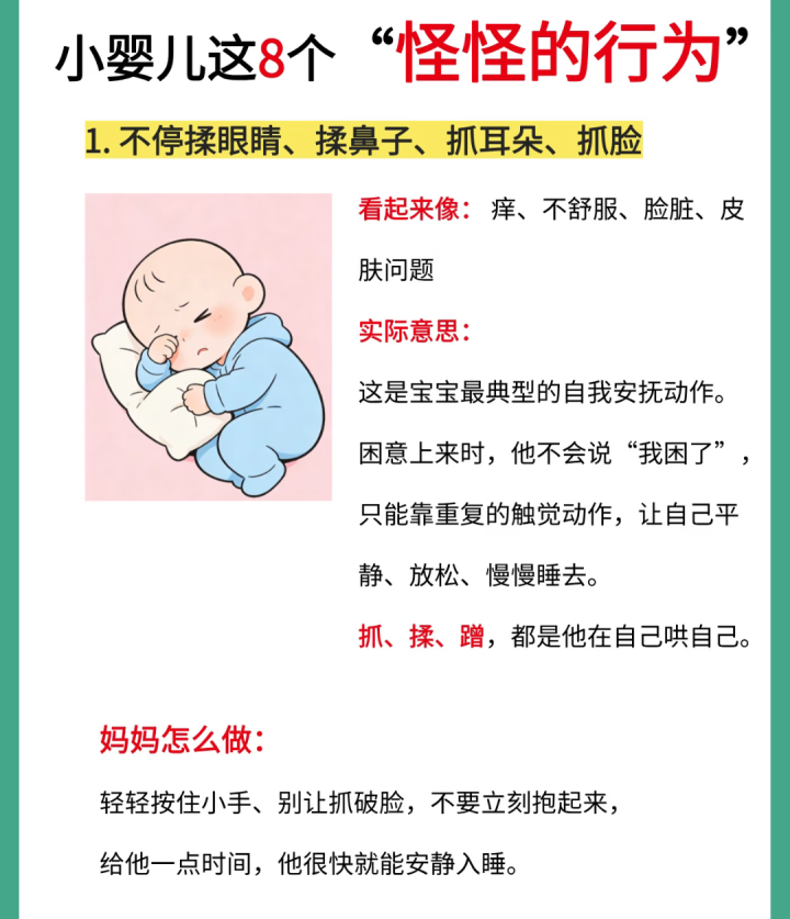 更特意旨兴致的是,B体育(BSports)有的宝宝会运转揉眼睛、揪耳朵,以致用小手用劲儿蹭我方的小脸。这些当作其实是在通过触碰来缓解疲乏带来的不适感,就像咱们大东谈主累了会揉太阳穴相似当然。他在尝试用我方的形式安抚我方,这是一次了不得的成长尝试。