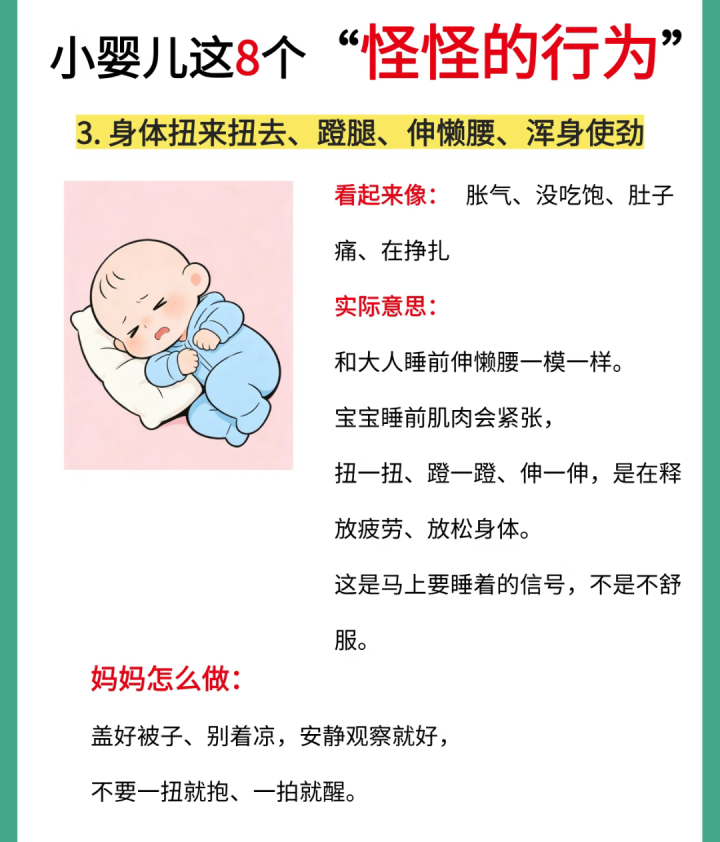还有些宝宝会把我方蜷成一个小虾米,小腿用劲儿往肚子所在收,然后短暂蹬直,小胳背也随着在空中挥舞。这看起来像在练体操,其实是他在开释体格里临了那少许实足的元气心灵,为入睡作念好准备。这时候放心地陪在身边,比抱着摇晃更能给他安全感。